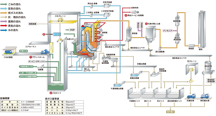 | ■排ガスの流れ | 焼却炉から発生したガスに消石灰と活性炭を吹き込み、ばいじんやダイオキシン類とともに、塩化水素、硫黄酸化物をろ過式集じん器で取り除き、脱硝装置で窒素酸化物を取り除いた後、クリーンなガスとして煙突から放出します。 | |