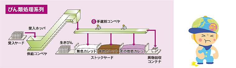 ■びん類手選別コンベヤ びん類を手作業で無色・茶色・その他色に分けます。選別されたそれぞれのびん類はカレットストックヤードに一時貯留されます。 |