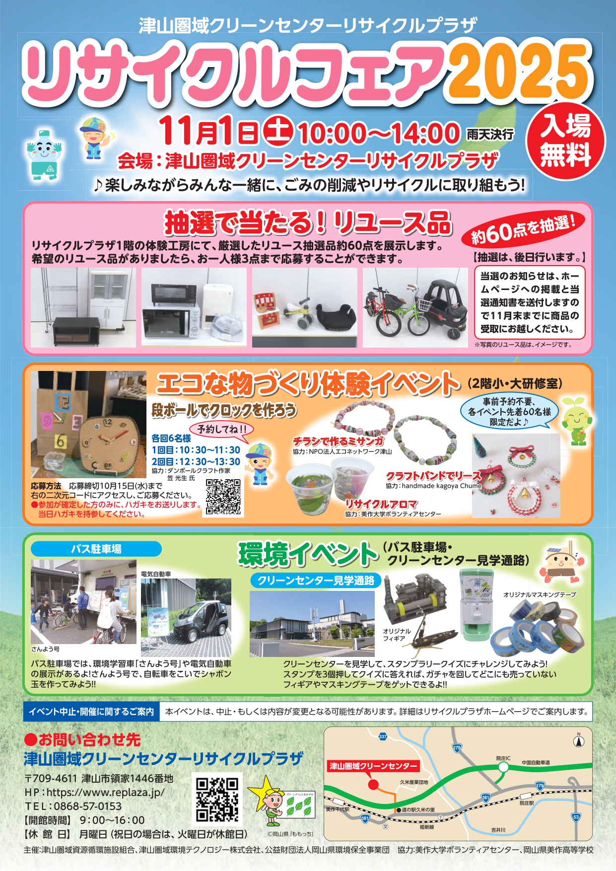 循環型社会をめざして 1,385,837 |HOME| 新着ニュース| 財政状況| 津山圏域資源循環施設組合議会| 組合例規集| MAP| 組合からのお知らせ| |HOME| 新着ニュース| 財政状況| 津山圏域資源循環施設組合議会| 組合例規集| MAP| 組合からのお知らせ| サイトマップ MENU 施設紹介と利用について ごみの持ち込みと分別 クリーンセンターだより 環境学習について 入札情報 工事(一般競争入札) 委託(一般・指名競争入札等) 随意契約等 結果 工事(指名競争入札) 委託(企画競争) 発注見通し 入札様式等 お問い合わせ 新着情報 掲載日 2025.09.26 「リサイクルフェア2025」(11/1)の開催について 今年もリサイクルフェアを下記日程で開催いたします。 日時:2025年11月1日(土)10:00~14:00(雨天決行)会場:津山圏域クリーンセンターリサイクルプラザ 詳細につきましては、リサイクルプラザの公式サイトでご確認ください。 新着情報一覧へ >> 津山市 鏡野町 勝央町 奈義町 美咲町 環境モニタ 過去の記事 2025 2024 2023 2022 2021 2017